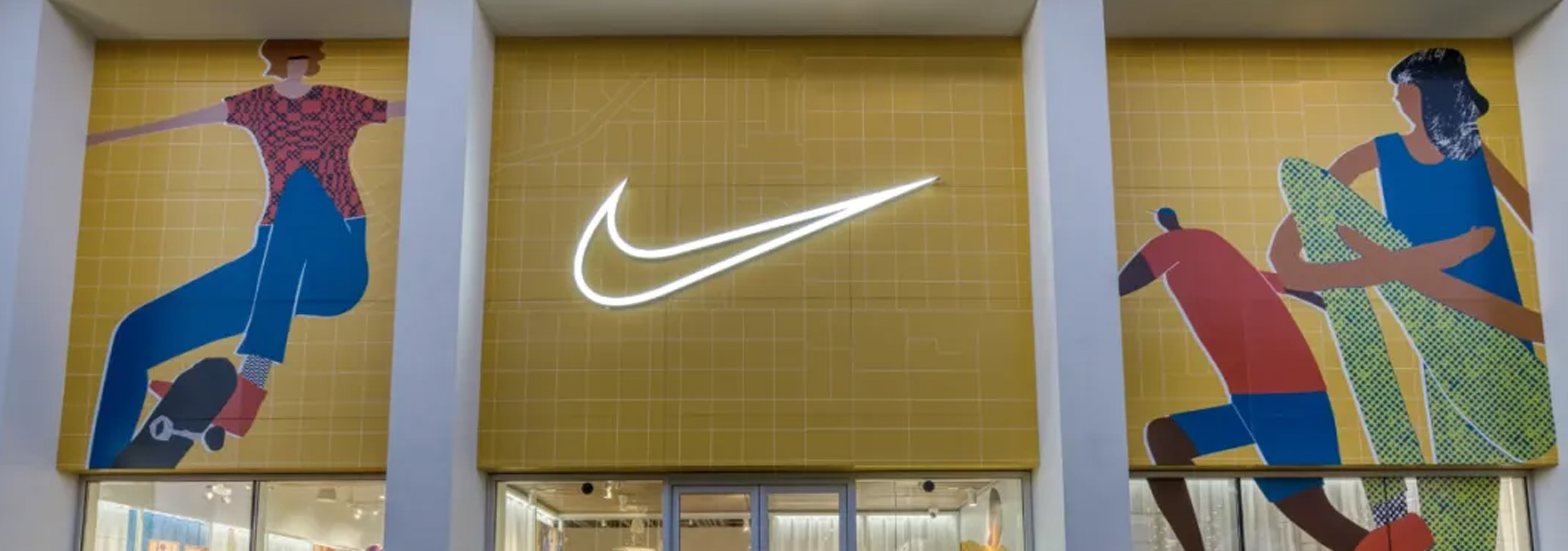 位于南洛杉矶的耐克专卖店门招表明品牌不仅关注社区传承,而且积极参与社区的发展。通过融入当地明星、文化符号和艺术元素,耐克将其品牌形象与社区的独特特征连接起来。其标识中就包含了对当地体坛有影响力人物的抽象画,如在南洛杉矶长大的运动员。耐克还与当地艺术家合作,将展示社区历史和文化的壁画融入店内。形象生动的大幅艺术作品以非洲以及拉美文化积淀为灵感,运用大胆的色彩和精巧的设计,反映了城市中常见的街头艺术。这种“以社区为中心”的设计理念,使标识成为归属感的象征,让耐克在消费者心中的定位,从一个销售鞋子的品牌,升华为一股提升当地文化的力量。
