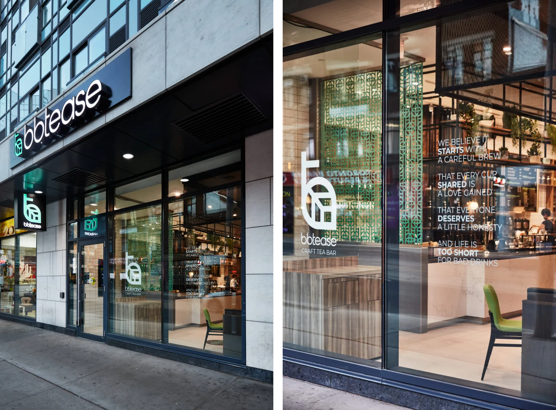 Bubbletease门招位相对主入口居中,采用立体字,呈现出干净的外观和立体的质感。标识的三维深度,确保了极高的可读性。精致的侧招有着异曲同工之妙——充满趣味性地用“bb”替代完整的单词拼写“bubble”,友好亲切;生动的绿色则传达了品牌对新鲜优质原料的重视。Bubbletease还利用橱窗平面设计传播其独有的品牌信息,例如,“We believe that it starts with a careful brew (我们相信它始于匠心和用心) ”。标识的高度正好与人们视线平行,便于路过的潜在顾客和顾客都能够轻松识别,并了解其所提供的服务。