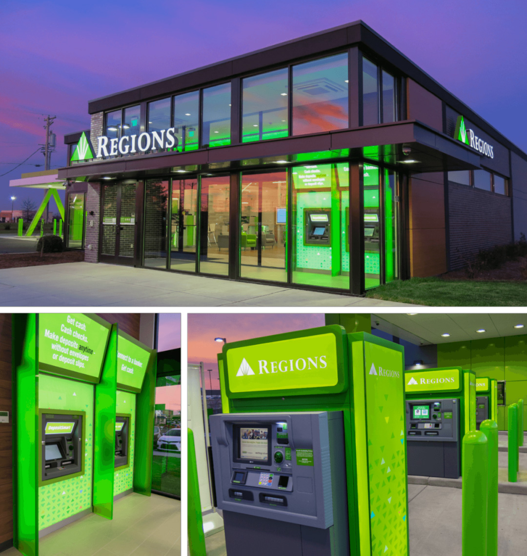 美国银行Regions Bank的外立面导视便是一个鲜明的例子。门照醒目地悬挂在外立面上方,长方形鲜绿色标识带LED背光效果,让行人在夜间仍可轻松识别。该银行网点的设计旨在营造一种通透感,因此配有大面积橱窗、强调数字屏的明亮灯光和24小时自助取款机服务。