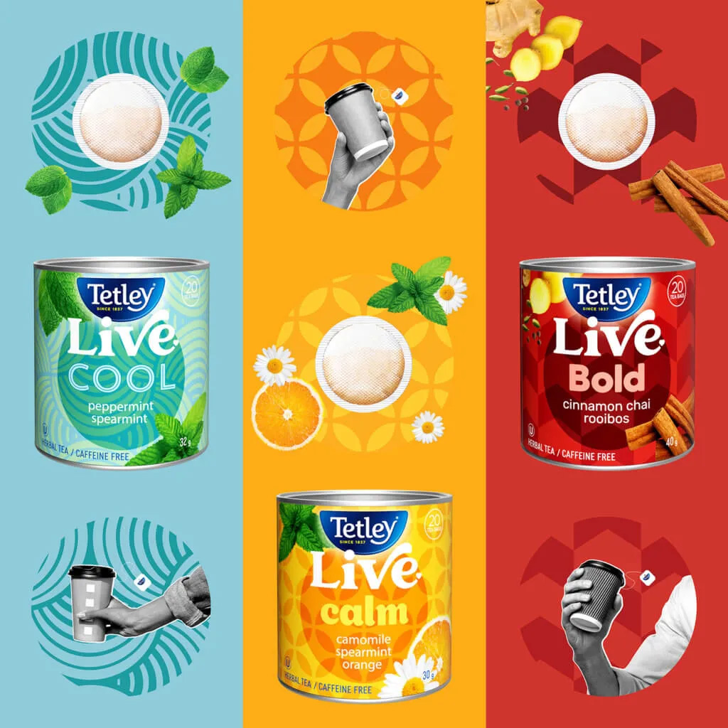 知名英国茶饮品牌Tetley(泰特利)为紧跟健康潮流,推出了三款Live Tea系列的草本茶饮。为了更好地呈现这三款茶饮的独特卖点和情感体验,分别为其设计了独特的图案、主题颜色和字体样式。同时,还分别使用了“Cool”、“Calm”和“Bold”等简单且贴近生活的词汇传递其情感体验。这些茶饮在货架上格外引人注目,吸引了大批有健康和口味诉求的消费者。