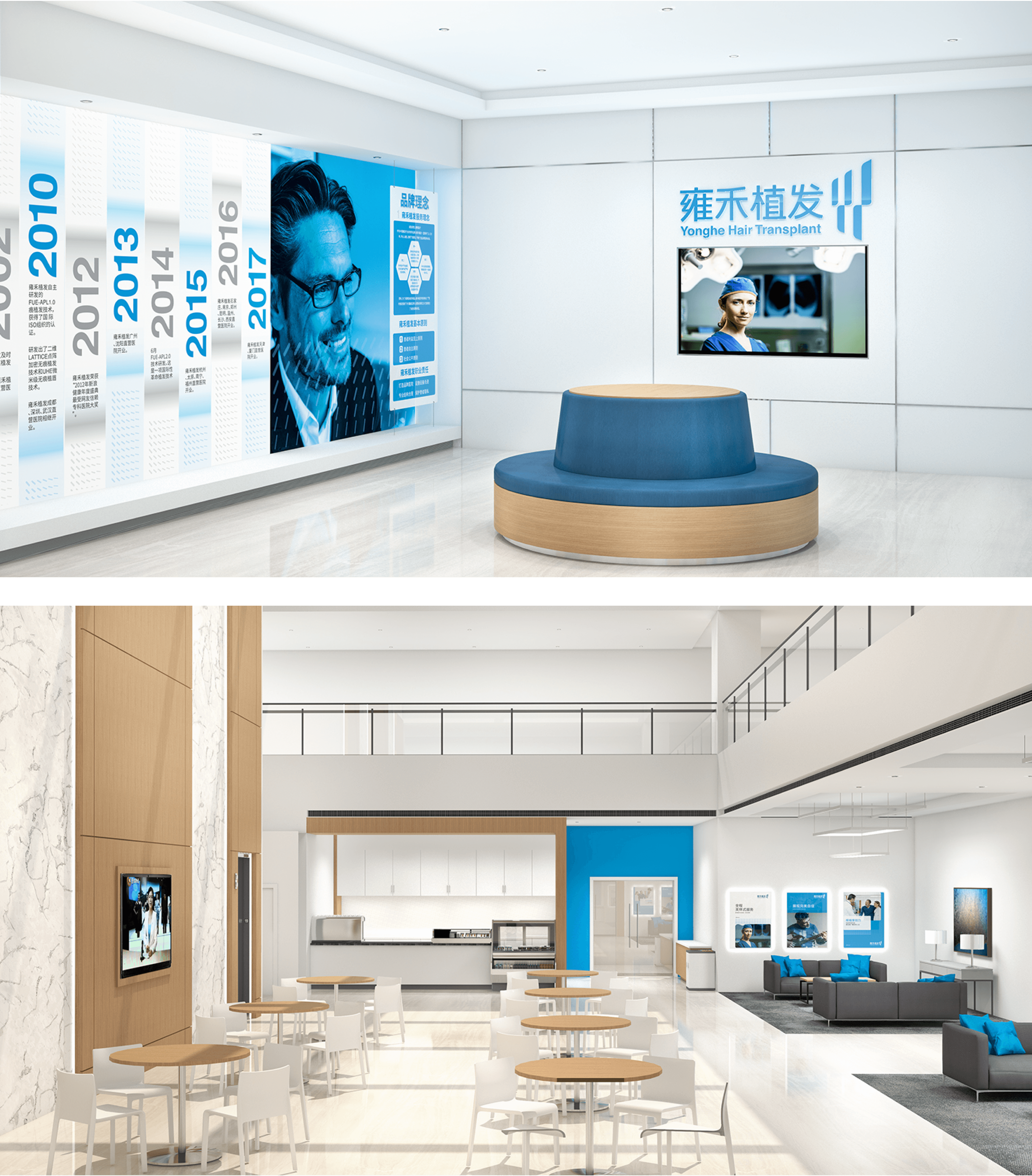 雍禾植发作为一家专业的植发机构,一直致力于通过不断地创新研究,向植发人群提供更好和更专业的服务。2017年初,雍禾植发委托加拿大SLD(睿来品牌设计公司),根据其升级版的VI系统和品牌定义,进行网点体验升级设计。设计的初衷与理念基于通过“专业”和“关爱”引导植发人群发现更美好的自己。以“体验感受历程”为切入点,通过设置舒适的等候区、专业医生与患者交流的办公室区,减轻客户的紧张情绪与压力。在整个体验空间里,SLD恰到好处地应用和选择了极具人性化的设计动线和空间环境材料,对植发人群的整个植发体验旅程进行了深刻的定义。